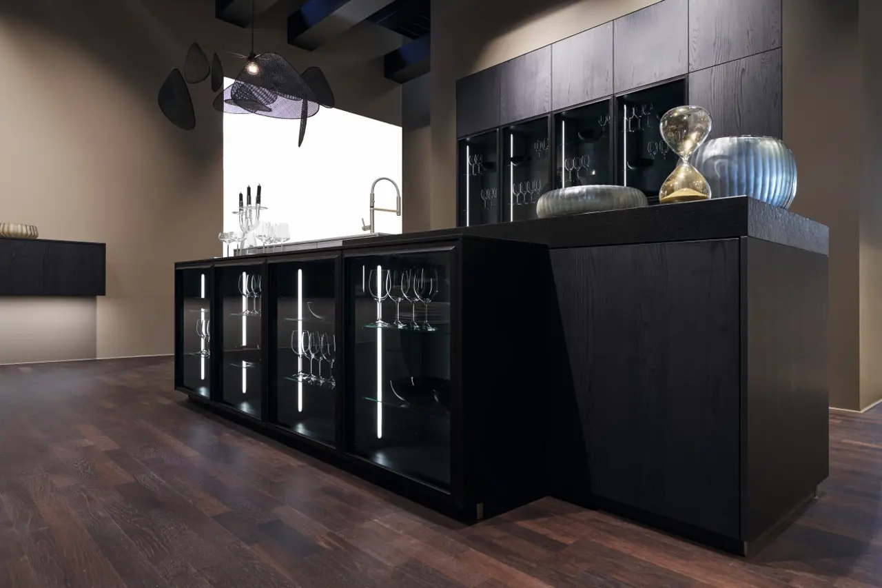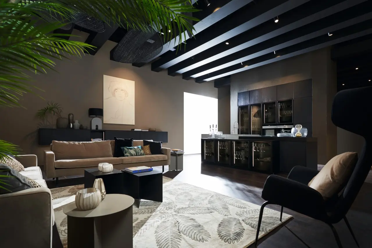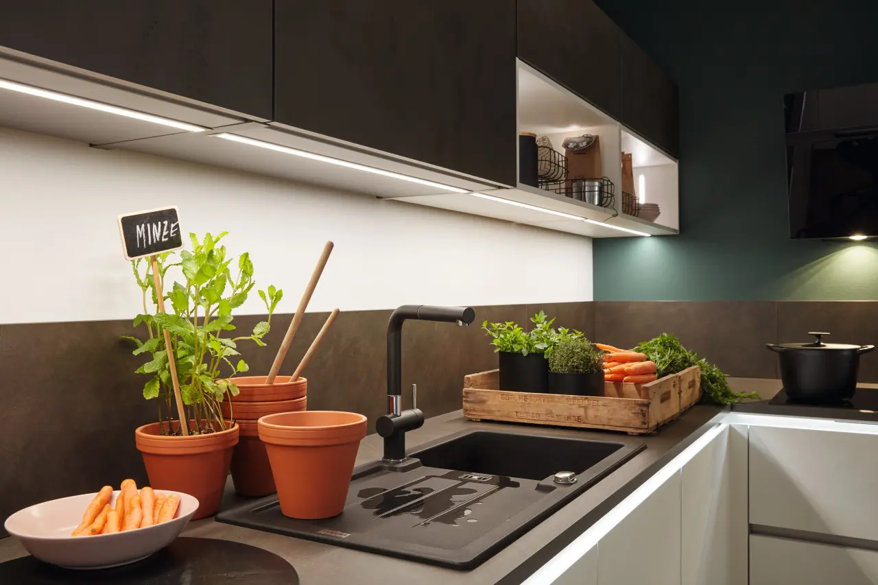 Staklene vitrine sa integrisanom LED rasvetom ne samo da ističu eleganciju, već i omogućavaju praktičan pregled posuđa. Organizacija fioka, radnih površina i skrivenih sistema za odlaganje garantuju efikasnost u svakom pokretu. Posebna pažnja posvećena je detaljima – od minimalističke sudopere do prirodnog bilja koje se uklapa u celinu prostora.