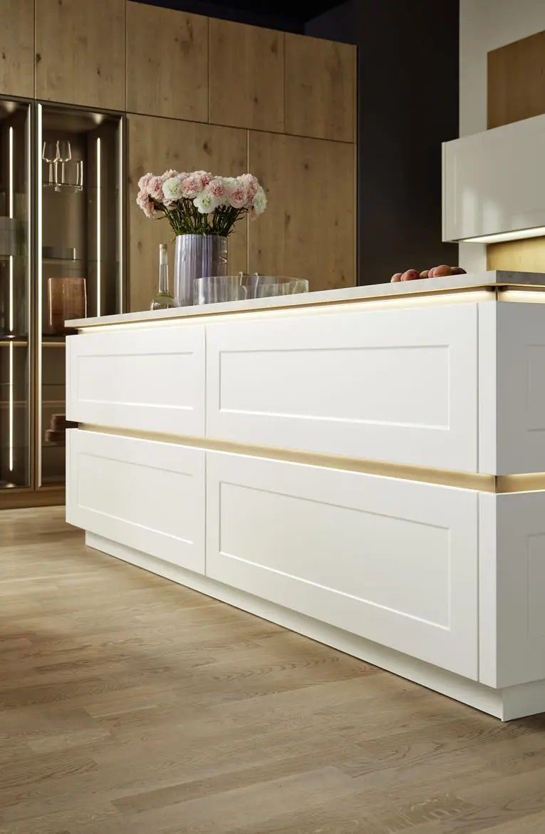 Bela ostrva sa dekorativnim LED osvetljenjem, kombinovana sa drvenim ili mat površinama, pružaju bezvremenski izgled i praktičnost u svakodnevnom korišćenju. Otvoreni elementi, vitrine sa rasvetom i organizovane fioke svedočanstvo su promišljene ergonomije i kvaliteta izrade. Svaki deo kuhinje Tavola može se prilagoditi vašem prostoru, bilo da je reč o prostranom porodičnom stanu ili elegantnom urbanom ambijentu.